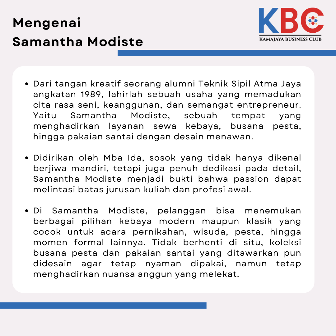 Dibuat oleh tangan-tangan penuh dedikasi, Samantha Modiste adalah cerminan kecantikan, ketekunan, dan kreativitas perempuan Indonesia.