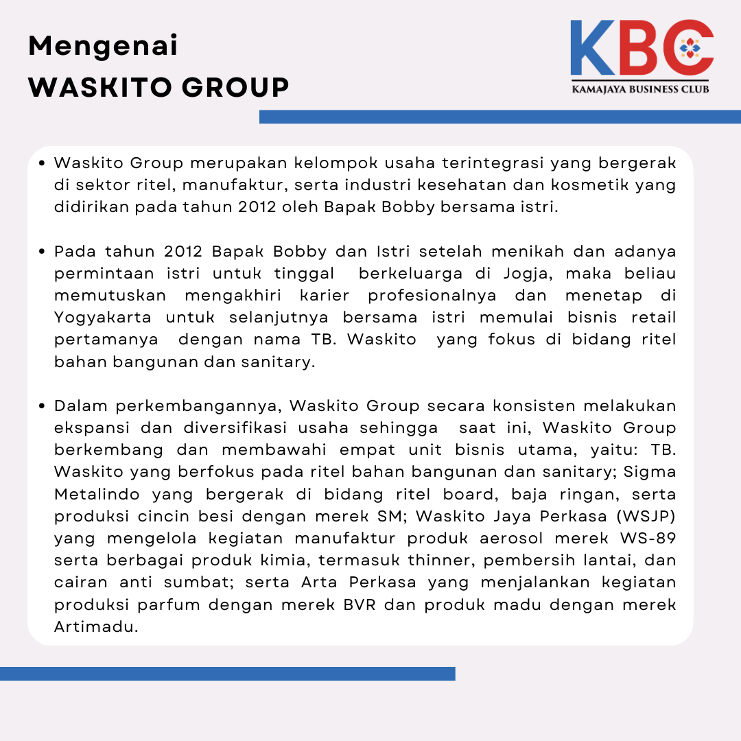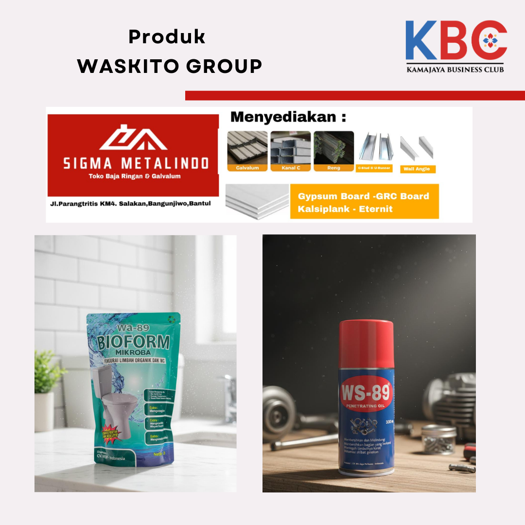 (TB. Waskito - SIGMA METALINDO -WSJP - Artha Perkasa ). WASKITO Group mengelola dan mengembangkan beberapa lini usaha yang beroperasi pada sektor ritel, manufaktur, serta yang terbaru pada industri kesehatan dan kosmetik.