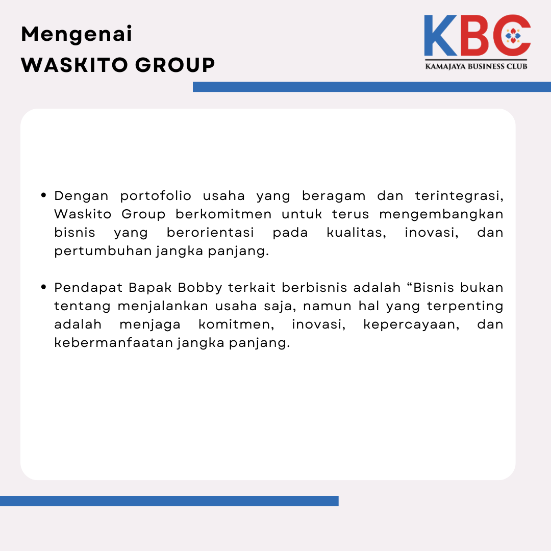 Bapak Bobby, Owner WASKITO Group, mengelola dan mengembangkan berbagai lini usaha mulai dari sektor ritel, manufaktur, hingga merambah industri kesehatan dan kosmetik.